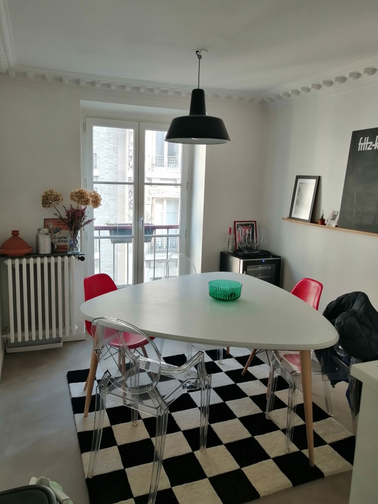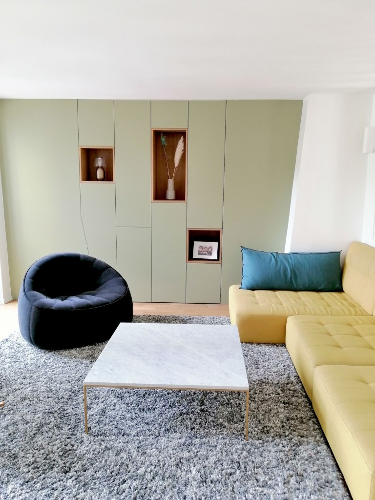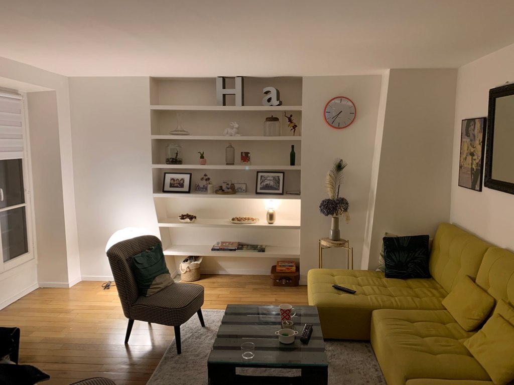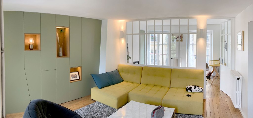 Appartement du 11ème arrondissement repensé avec une attention particulière portée à l’agencement du salon.