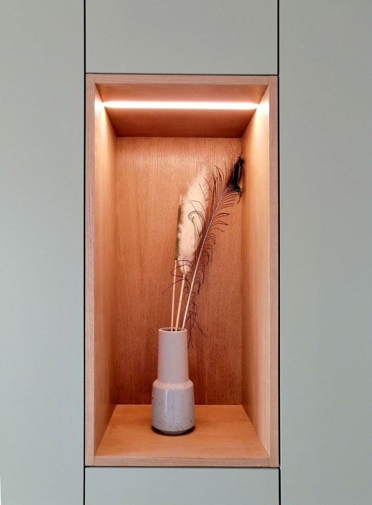 Des placards sur mesure ont été créés pour s’adapter parfaitement aux volumes existants, tandis qu’une verrière a été installée afin de laisser la lumière traverser la lumière.