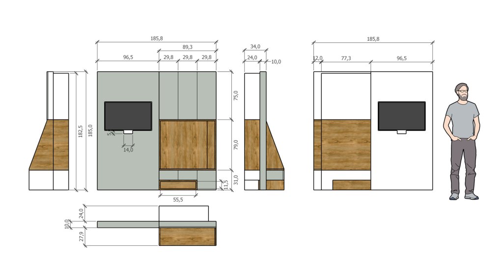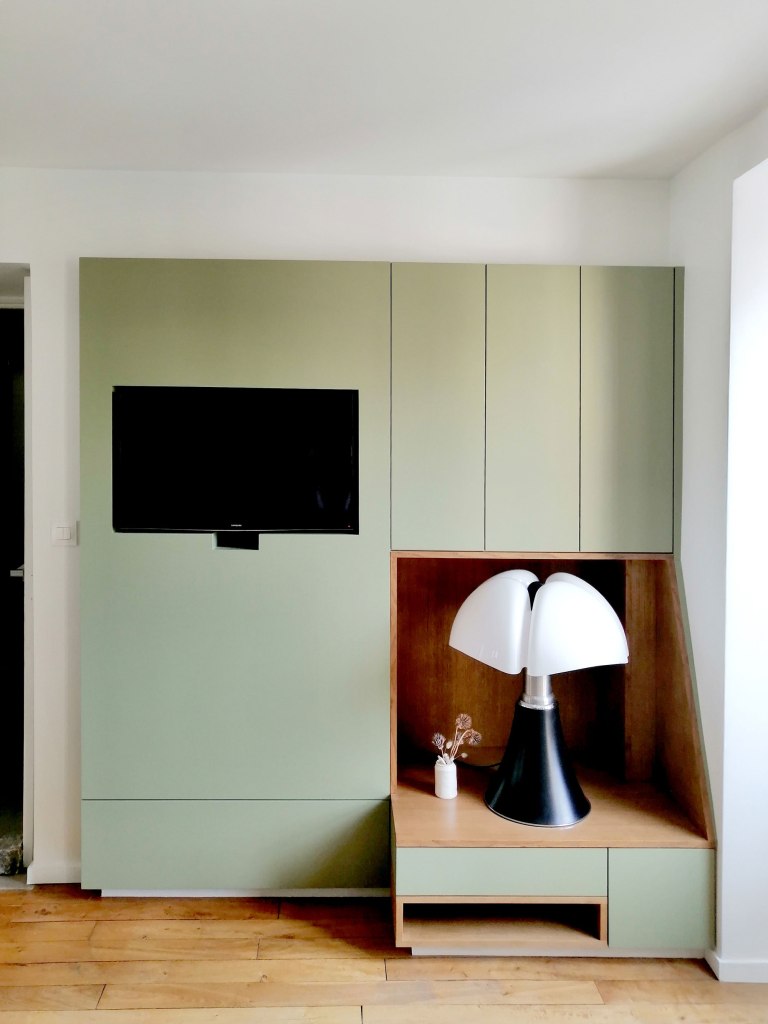 Le meuble TV, conçu sur mesure, intègre harmonieusement la lampe Pipistrello, un objet cher au propriétaire, qui a ainsi trouvé sa place idéale.