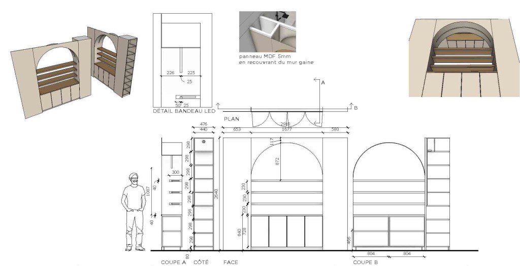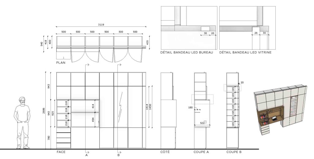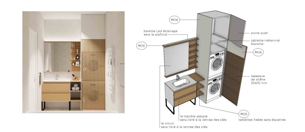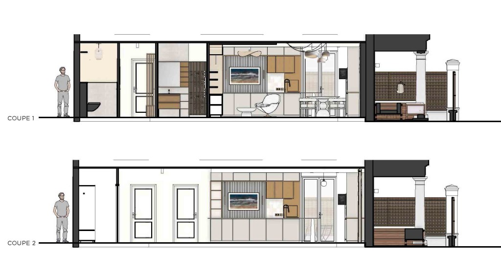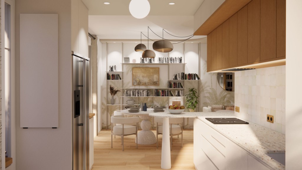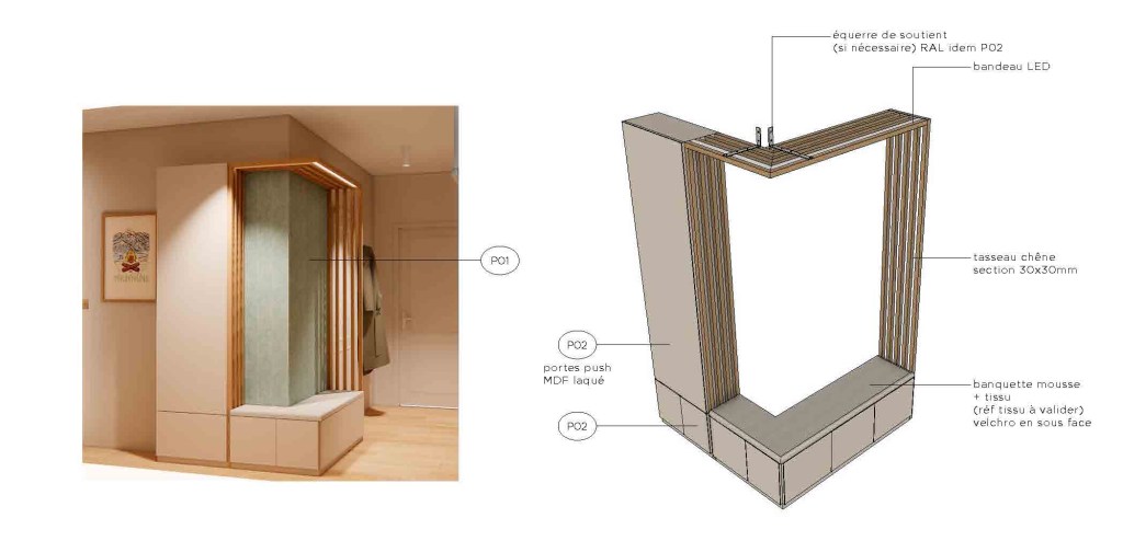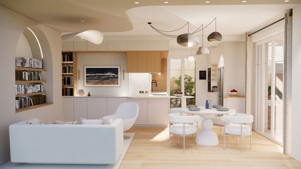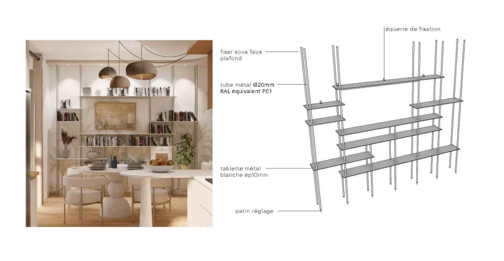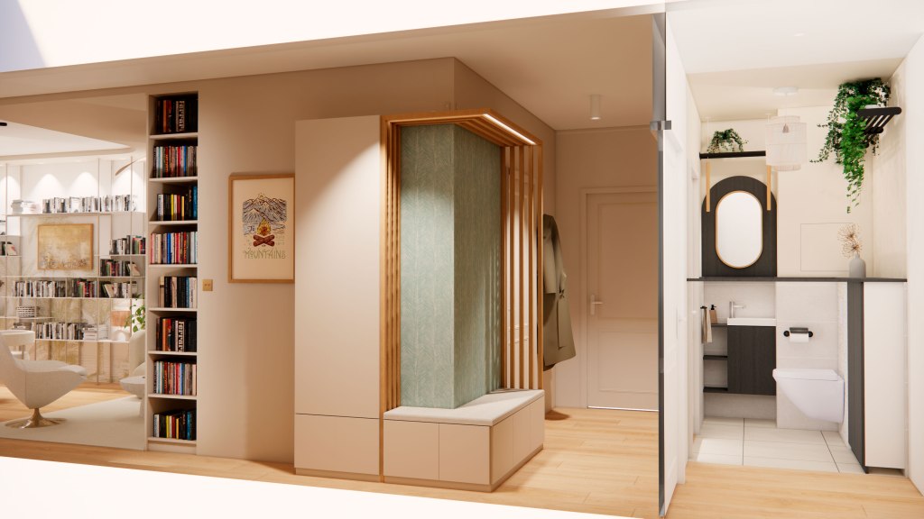 Des rangements intégrés dès l’entrée et une bibliothèque sur mesure optimisent les volumes tout en apportant du caractère.