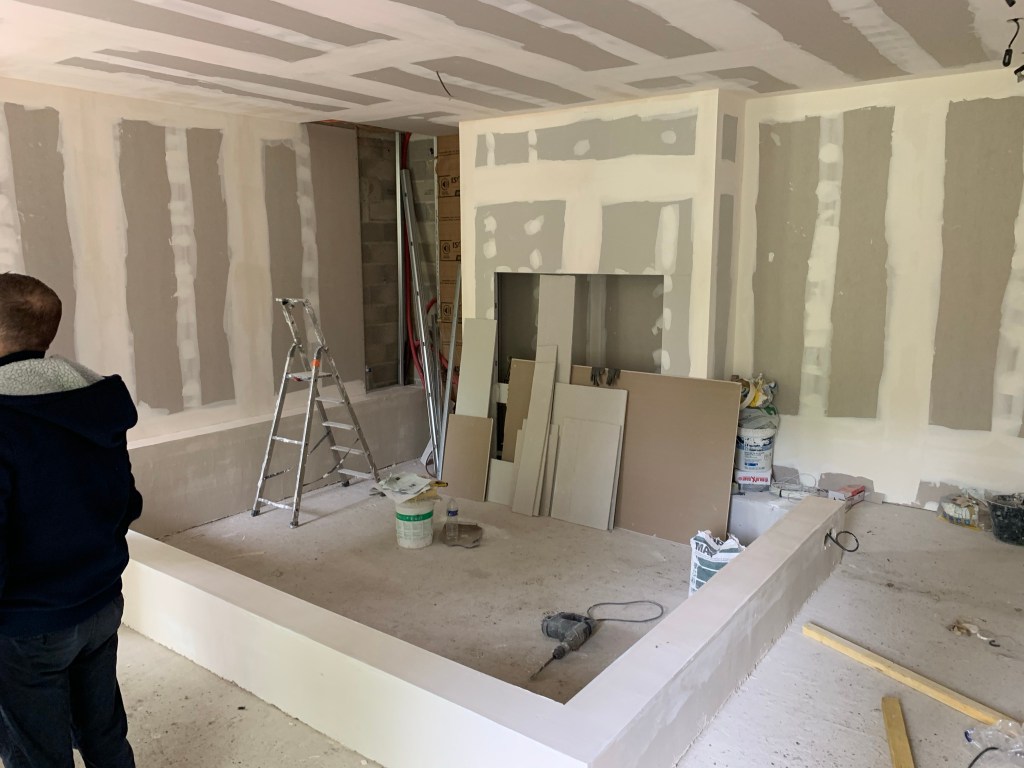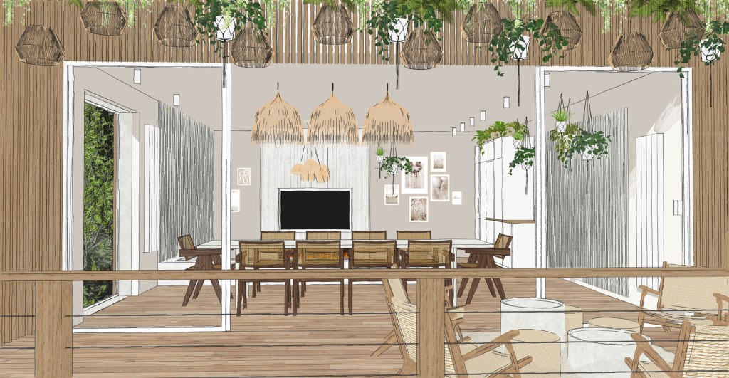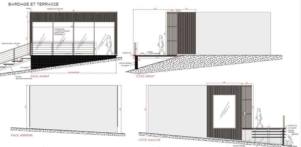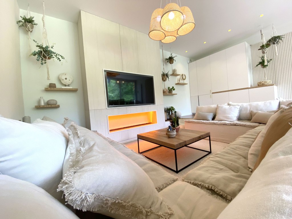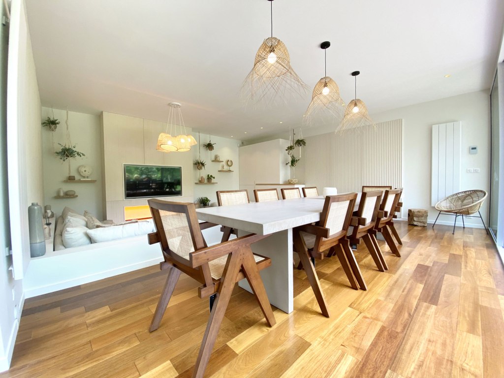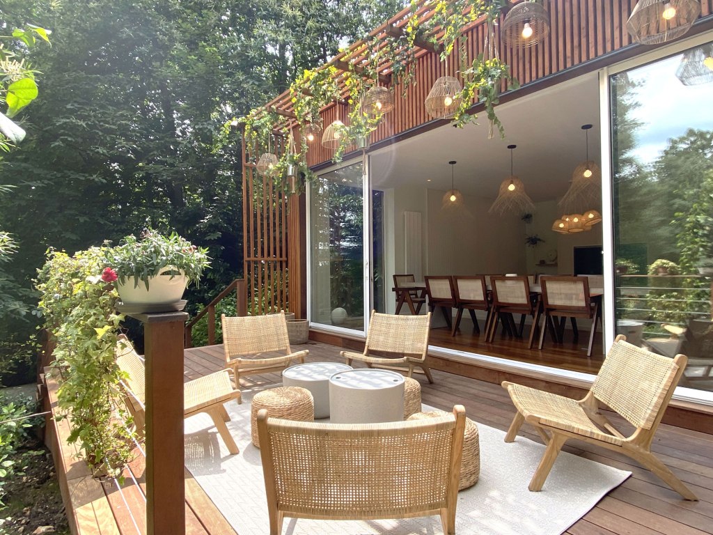 La terrasse en bois et la large ouverture de la façade effacent les frontières entre intérieur et extérieur. Un salon légèrement en contrebas et une cheminée à l’éthanol créent une atmosphère intime, idéale pour des moments chaleureux en famille.