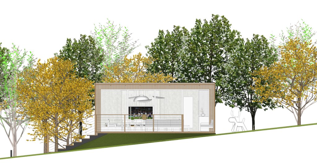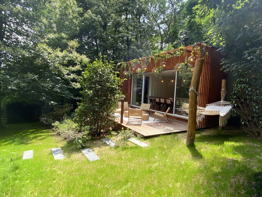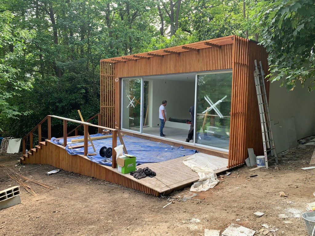 Niché au cœur d’un jardin arboré, ce pavillon a remplacé une ancienne cabane, transformant l’espace en un havre de paix raffiné.