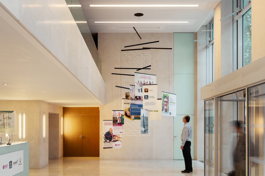 Un mobile suspendu met en valeur la communication des différentes marques du groupe, offrant une présentation visuelle légére et dynamique.