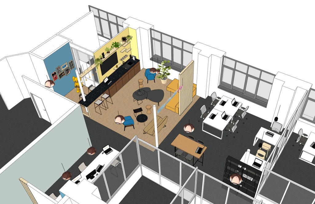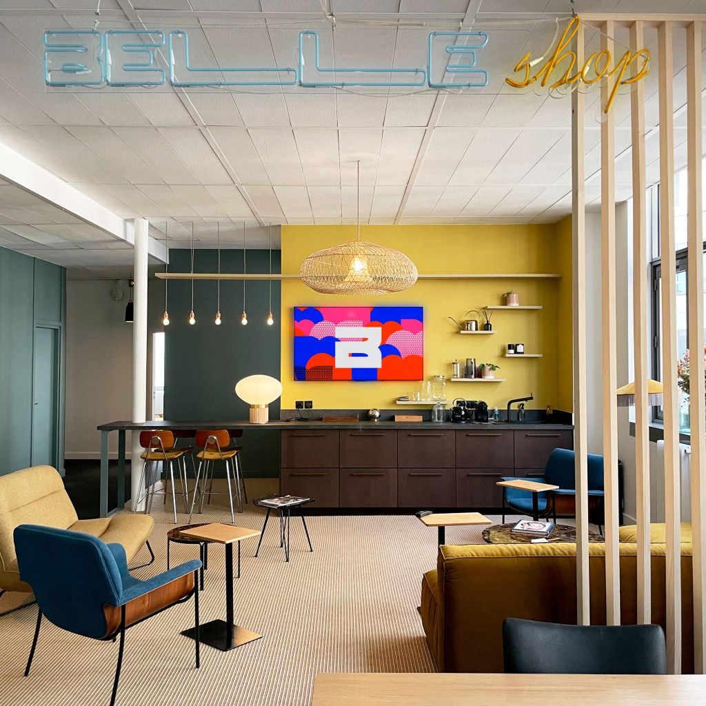Transformation d’anciens bureaux cloisonnés en un espace ouvert et central, conçu pour favoriser les échanges informels. Ce lieu polyvalent est idéal pour des réunions détendues, des moments de pause en journée ou des afterworks conviviaux, créant ainsi un environnement propice à la collaboration et à la convivialité.