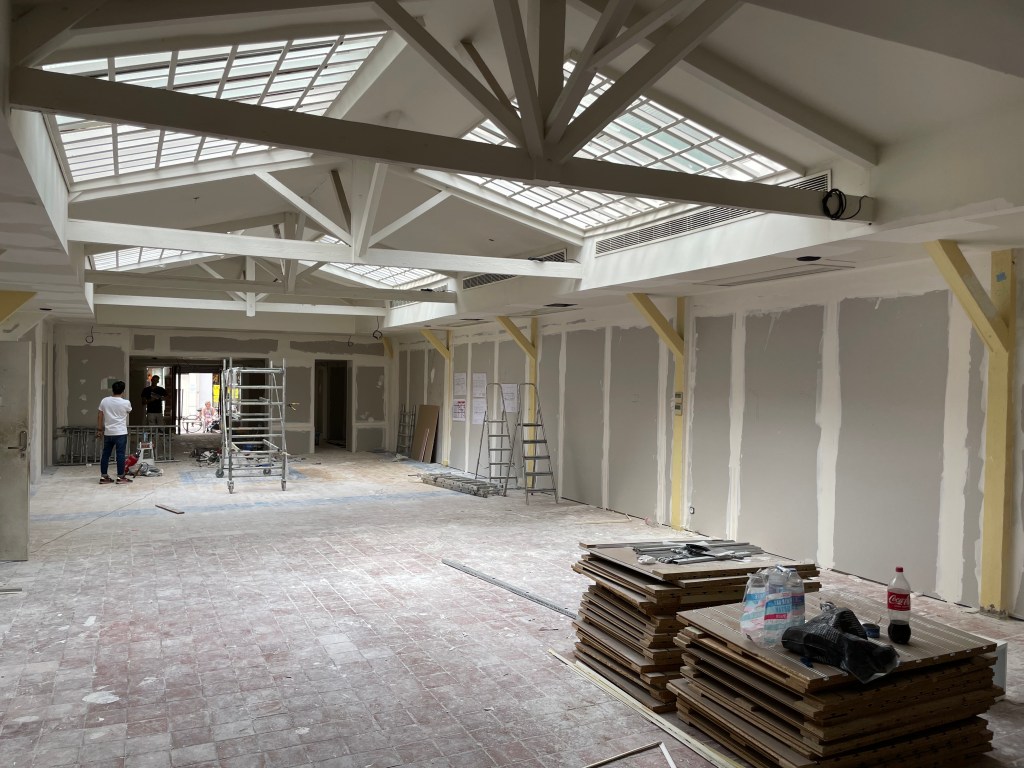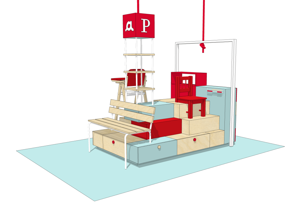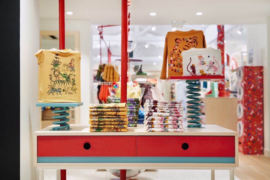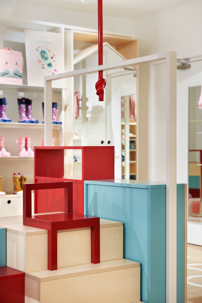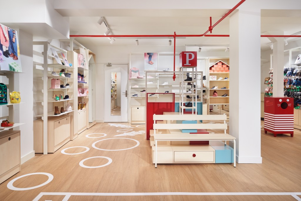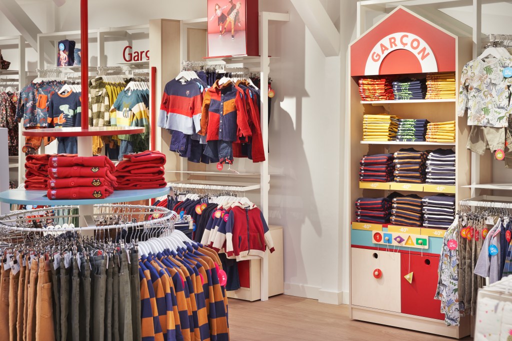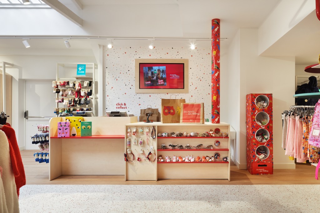 L’enseigne de prêt-à-porter souhaitait concevoir un espace où parents et enfants se sentent à leur place. Nous avons imaginé un lieu à la fois ludique et interactif, inspiré par l’univers des enfants, intégrant des éléments comme le ressort de jeu à bascule, le banc d’école, les cubes en lettres, la marelle ou encore la chaise haute. Des jeux ont été stratégiquement installés sur les descentes, servant à la fois de rupture visuelle et de support signalétique pour délimiter les différents univers.