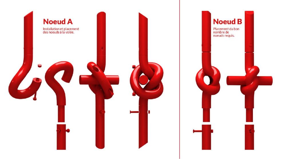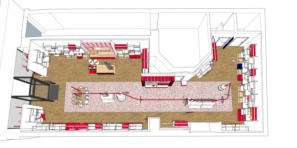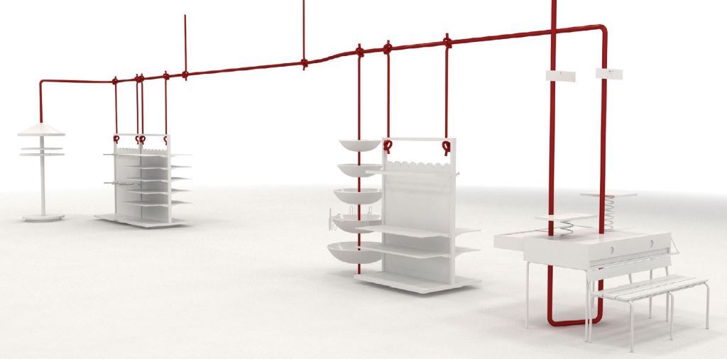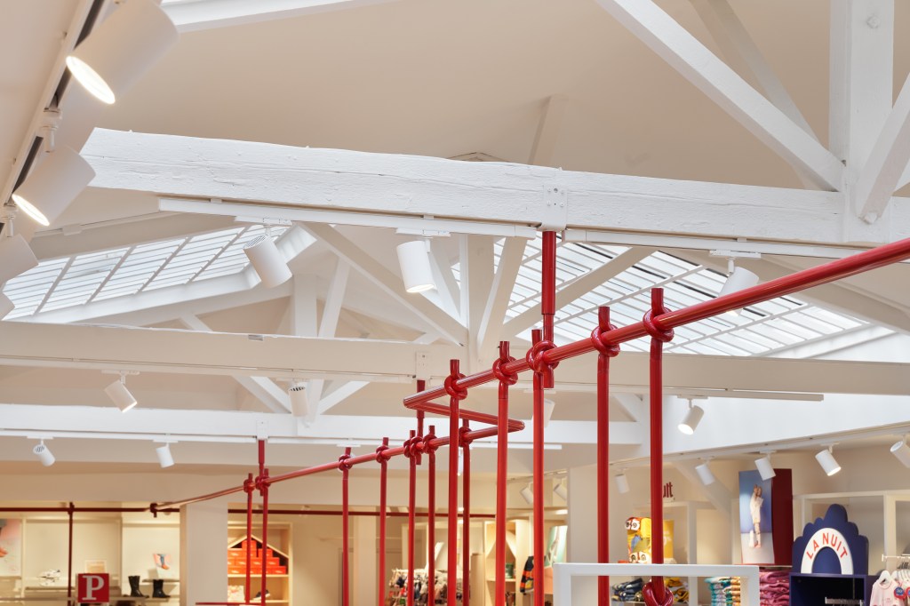 Un fil rouge en métal, aux couleurs de la marque, guide le client depuis la façade jusqu’au fond de la boutique. Ce fil permet d’accueillir des nœuds rouges (impression 3D et peinture) qui soutiennent le mobilier spécifique tout au long du parcours. Cet élément flexible est aussi un outil pratique pour les équipes en magasin, en permettant l’ajout de signalétique ou de décoration saisonnière