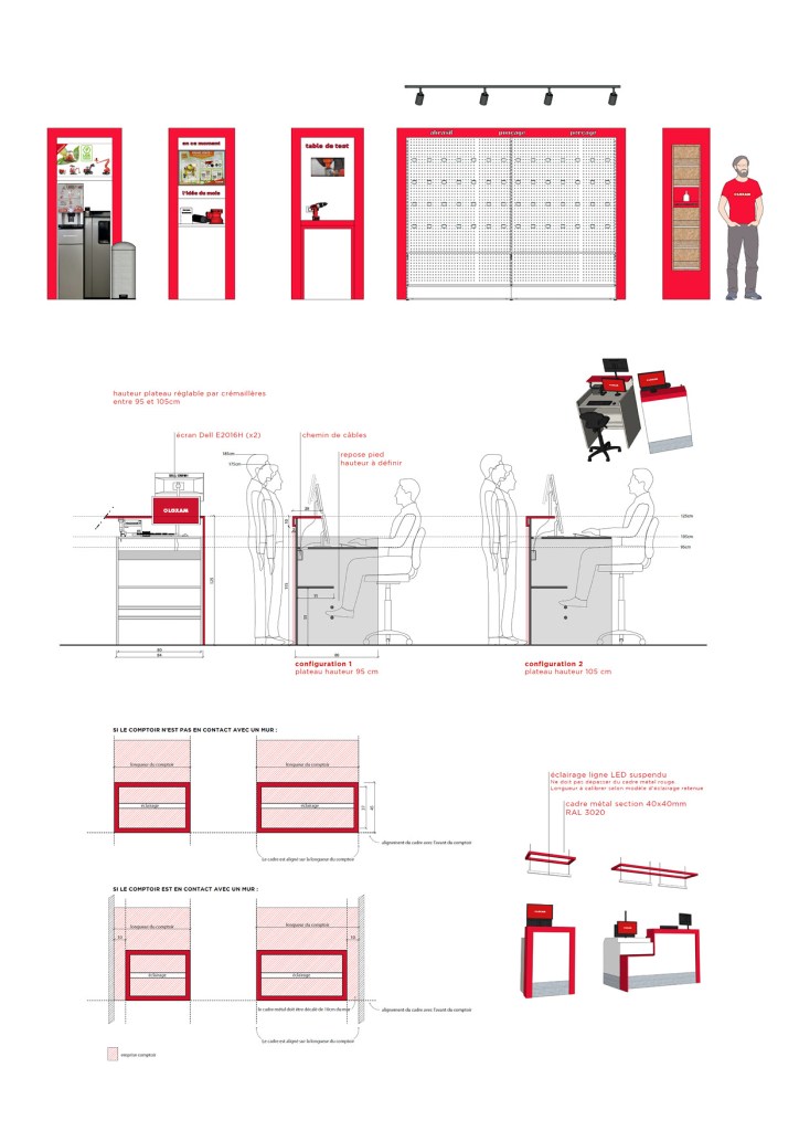 Pour son réseau en centre-ville parisien, Loxam avait besoin de développer un concept sur mesure. Nous avons donc repensé l’aménagement des boutiques en créant un comptoir spécifiquement conçu pour répondre aux besoins des professionnels et des particuliers qui fréquentent ces sites. En collaboration avec les équipes Loxam, nous avons retravaillé l’ergonomie de ce comptoir afin d’offrir un confort optimal et une grande adaptabilité aux différents profils d’utilisateurs. Le parcours client a été simplifié et des éléments de mobilier signalétiques ont été installés pour apporter une meilleure lisibilité et fluidité à l’ensemble de l’espace.